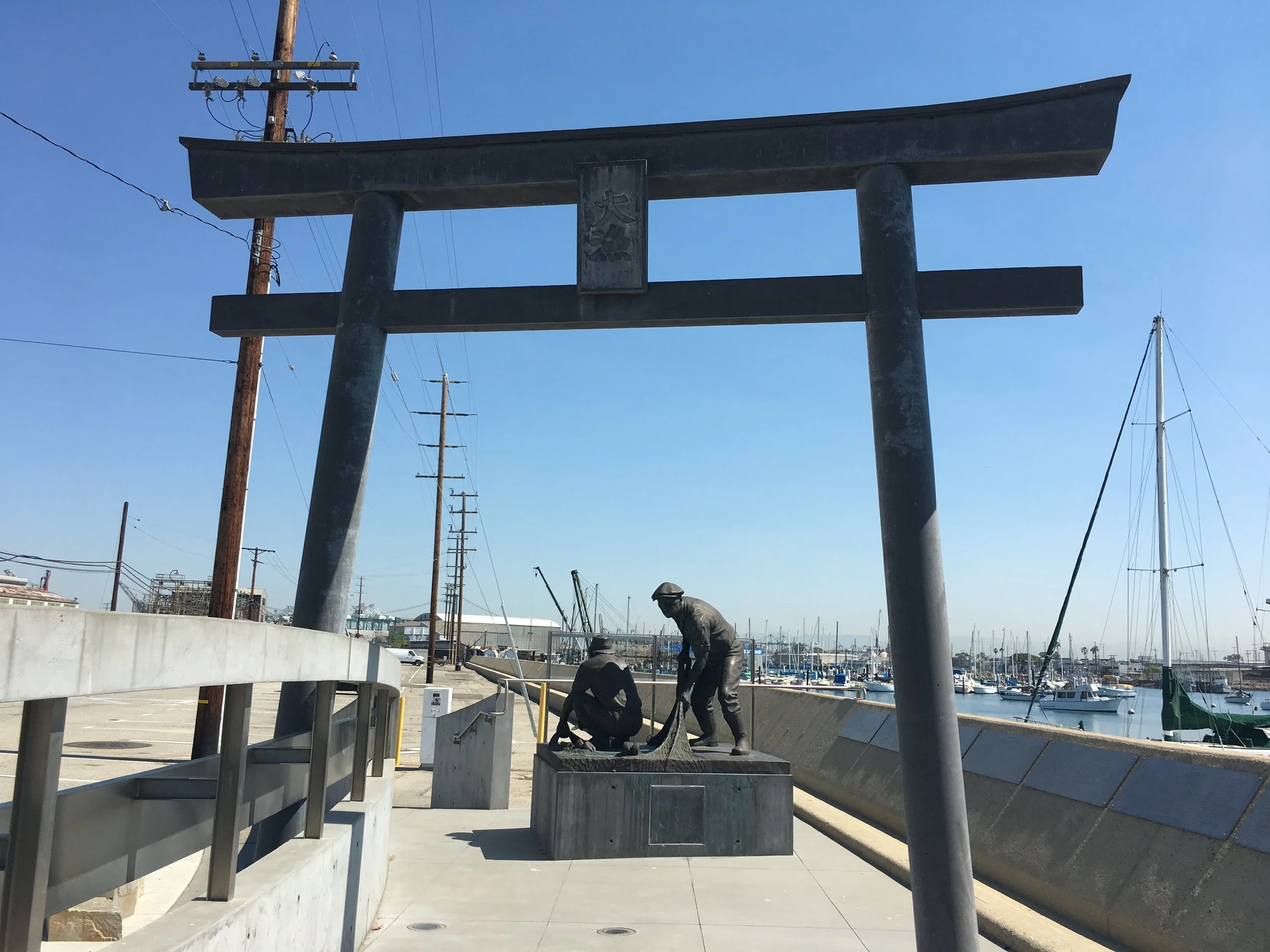 South of Los Angeles, nestled within the city of San Pedro and neighboring Long Beach, lies Terminal Island. On Seaside Avenue, in all its industrial backdrops among shipyards stands a humble yet remarkable monument overlooking the water. Only this memorial today stands as a remembrance to the vibrancy that existed here decades before. The hollow vacancy, with such sterile structures that surround it today, makes me grieve for a community long gone. What stands out here at the Terminal Island Japanese Fishing Village Memorial are poignant components of a torii gate, two fishermen captured in a working pose, and a Japanese poem that reads: